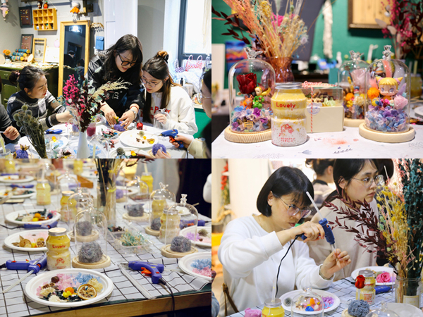 活動現(xiàn)場,花藝師就如何安放主花、固定花瓣、插花造型等步驟和技巧等進(jìn)行了詳細(xì)講解。大家選擇好心儀的花材,充分發(fā)揮創(chuàng)意和想象力,精心將每一朵花、每一片葉插放和鋪貼,使原本樸實無華的花托瞬間花團(tuán)錦簇、生機(jī)盎然?;顒又校蠹夷闱魄莆业?,我看看你的,相互交流搭配心得,在歡聲笑語中完成了一份份精美且獨(dú)一無二的永生花作品。大家手捧親手制作的永生花合影留念,定格美好瞬間。