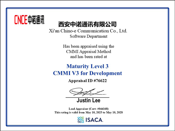 CMMI認證被譽為全球軟件行業的“黃金標準”,是全球軟件與系統開發領域最具權威性的能力成熟度評估體系。此次成功通過CMMI3級認證,表明西安中諾已具備規范化、標準化和持續優化的研發體系,將為客戶提供更加高效、穩定、可持續的數字化解決方案,為高品質交付提供有力保障。